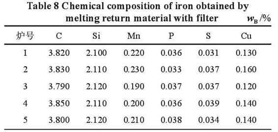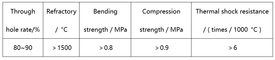 3. Classification and characteristics of filter network In the process of cast iron production, foam ceramic filter, fiber filter and honeycomb ceramic straight hole filter should be the most. Through long-term production practice comparison, the three kinds of filters have different characteristics. 1)Fiber filter mesh: It is a mesh with certain stiffness, which is made on the basis of high silica glass fiber mesh cloth and die yarn mesh cloth as the substrate surface, coated with high temperature resistant coating and special drying treatment. It has the effect of mechanical interception and rectification of dross, and can filter out inclusions larger than the mesh size. Compared with the ceramic foam filter, the fiber filter does not have the slag blocking effect that produces deep adsorption effect, so the purification effect of fiber filter on metal liquid is general. The biggest advantages of the filter are simple fabrication, light weight, low price, almost no cavity space, no ignition, low gas production, and resistance to metal melt erosion. In addition, the size can be cut on demand according to different casting methods and gating system types. Can be used for non-ferrous alloy casting, can also be used for cast steel and cast iron. General fiber filter process performance as shown in table 1. Table 1 Process performance of fiber filter 2)Foam ceramic filter: Polyurethane foam is cut into the required shape ( generally block and round ), and then put into the ceramic slurry to fully soak, to be adhered evenly and then dried and roasted. The filter has a skeleton structure of ternary mesh with continuous pores, about 85 % of the porosity, and has a skeletal surface area when contacting with metal liquid, which can produce deep adsorption effect. Therefore, the slag filtering effect is obvious. The process performance of foam ceramic filter is shown in table 2. Table 2 Process performance of foam ceramic filter 3)Honeycomb ceramic straight-hole filter: a high strength filter made of mullite (cordierite) ceramic material is designed to ensure the balance between strength and metal flow. It has very high working strength at high temperature, thermal shock resistance and metal liquid thermal shock resistance. It has high room temperature strength and mechanical shock resistance, and generally does not appear rupture and damage during transportation and use. It can effectively reduce the metal liquid turbulence caused by pouring and make filling smooth. It has a large metal flow rate, and the flow rate is relatively stable. Even if the inclusion content in the metal liquid is large, the filter network is not easy to be blocked in the use process. Can be widely used in non-ferrous alloy and black metal casting process.