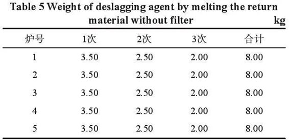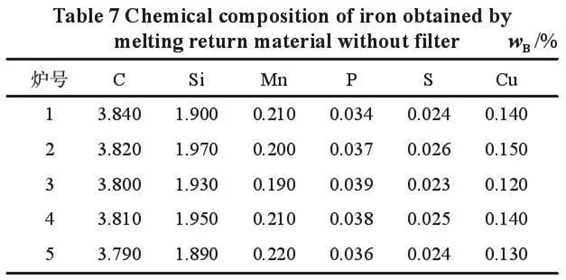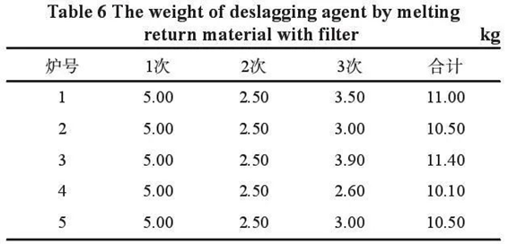 5. Harm and improvement of filter residue In the long-term casting process, a large number of filters are used. After pouring, the contact between the filter and the high temperature metal liquid is seriously burned and crushed, and the residue of the filter will directly enter the recycled sand. The quality of the recycled sand is deteriorating, which affects the overall performance of the wet molding sand. It can be seen from Fig. 2, Fig. 3 and Fig. 4 that the residual states of the three kinds of filter residue in the recycled sand are respectively. The filter mesh is directly contacted with the high-temperature metal liquid. After solidification, it will become a part of the furnace charge. These filter mesh residues that are difficult to be removed in the furnace charge will also continue to increase the difficulty of smelting and slag removal, and have serious erosion consequences on the lining, and ultimately affect the comprehensive quality of metal liquid. Filter residue that is difficult to remove by shot blasting is shown in Figure 5. Fig 2: Fiber filter residue in recycled sand Fig 3: Foam ceramic filter residue in recycled sand Fig. 4: honeycomb ceramic straight-hole filter residue in recycled sand Fig 5: Filter residue difficult to remove by shot blasting 5.1 Test scheme A casting workshop is equipped with two DISA casting production lines with the same sand treatment system, melting, pouring and sand falling equipment. The long-term production process of Line 1 is relatively complex and a large number of castings are used screen are used in the pouring system. The long-term production of Line 2 is relatively simple and does not use the filter screen. The specific test scheme is as follows : 1)In the normal production process of the workshop, the recycled sand with relatively consistent moisture content recovered by the sand falling machine was used as the raw material for sand mixing in line 1 and line 2, respectively. The bentonite and coal powder with the same type and specification were used as auxiliary materials, and the sand was mixed under the guidance of the same sand treatment operation instruction. At the same time in the 1 # line and 2 # line production of the same kind of casting ( note : the same product, mold has two sets, one set of mold is the left side of the casting, the other set of mold is only arranged on the right side of the casting ). At 30 min, 60 min, 90 min, 120 min and 150 min after the start of production, five groups of molding sand samples were randomly selected at the end of the sand conveying belt that is about to enter the automatic molding room above the DISA molding machine of line 1 and line 2, respectively, for testing the molding performance. 2)In the 1 # line and 2 # line, respectively, using the blast furnace material which has been processed by the shot blasting machine and the surface cleanliness is relatively consistent as the smelting raw material, using the same type and specification of pig iron, scrap and so on as the auxiliary material, under the guidance of the same smelting operation guidance. Above the medium frequency induction furnace of 1 # line and 2 # line, the metal liquid of the first furnace, the second furnace, the third furnace, the fourth furnace and the fifth furnace which meet the requirements of the chemical composition and temperature of the product are sampled. Each furnace takes a spectral test piece, and uses the same spectrometer to detect the chemical composition of a total of 10 samples of the two lines. 3)Similarly, above the medium frequency induction furnace, the amount of slag remover used in each of the above five furnaces of metal liquid from the beginning of melting to the beginning of tapping was recorded. The first addition of slag remover to each furnace is conducted when all furnace charge in the furnace is melted from solid to liquid. After adding carbonizer in the furnace, waiting for 6 min of absorption and heating time, slag remover was added for the second time for slag removal. Before discharging, in order to ensure the purity of metal liquid, slag remover was added for the third time to remove slag in the furnace. 5.2 Comparison of test results Through the comparison of sand mixing test, using the recycled sand with long-term use of the filter, using the same raw material, ratio, mixing equipment and mixing method of sand mixing, and comparing the performance of molding sand mixed with the recycled sand without the use of the filter, it can be seen from Table 3 and Table 4 that the performance of molding sand in each of the five groups of the two lines is very different, especially the strength and compaction rate are very different. Table 3: Properties of molding sand mixed with recycled sand without filter Table 4: Properties of molding sand mixed with recycled sand using long-term filter Through the comparison of melting experiments, the same raw materials, ratio, slag remover, melting equipment and methods were used for melting the return charge with long-term use of filter. Compared with the metal liquid melted by the return charge without filter, under the condition of melting 4 t of molten iron in each furnace, it was found that the slag removal intensity of the return charge with filter increased during the melting process, and the difficulty was significantly improved. As can be seen from tables 5 and 6, the molten iron with the same tonnage, three separate slag removals and the same purity required for tapping was melted by the return burden with long-term use of filters. A total of 53.50 kg slag remover was used in five furnaces, with an average of 10.70 kg slag remover per furnace. Compared with the return burden melting without filters, a total of 13.50 kg slag remover was consumed in five furnaces, with an average of 2.7 kg slag remover per furnace. By comparing the chemical components, it can be seen from Table 7 and Table 8 that the chemical components of the two line